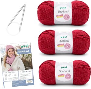 Gründl Strickset 3 x 100 g Shetland Wolle Strickgarn + Nadel 7 - 8 + Anleitung zum selber Stricken, 30 x 20 x 8 cm, rot